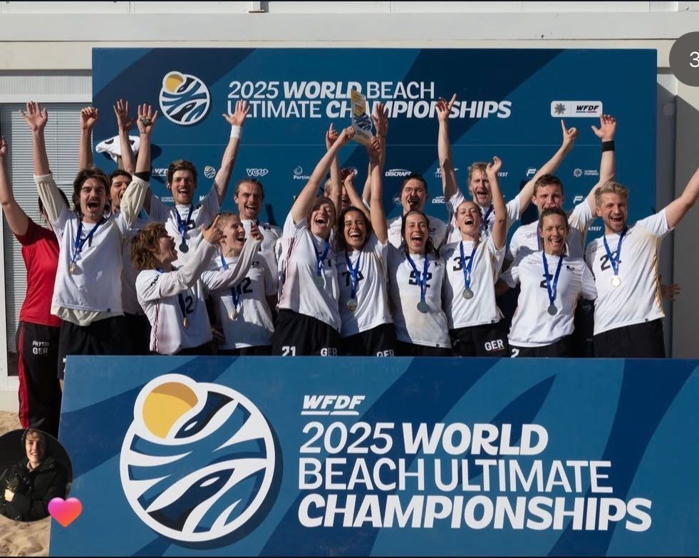 Nationalmannschaft bei der Beach-WM in Portimão an. Die hübschen Sandstrände und das blaue Meer dieser Hafenstadt im Süden Portugals sind sicherlich beeindruckend - die Frisbee-Turniere, die dort abgehalten wurden, jedoch auch. In der Kategorie „Mixed“ (Frauen und Männer spielen gemeinsam) traten 27 Länder aus allen Ecken der Welt an. Für die deutsche Nationalmannschaft, mit welcher Charlotte antrat, bedeutete das 13 Spiele in 7 Tagen.