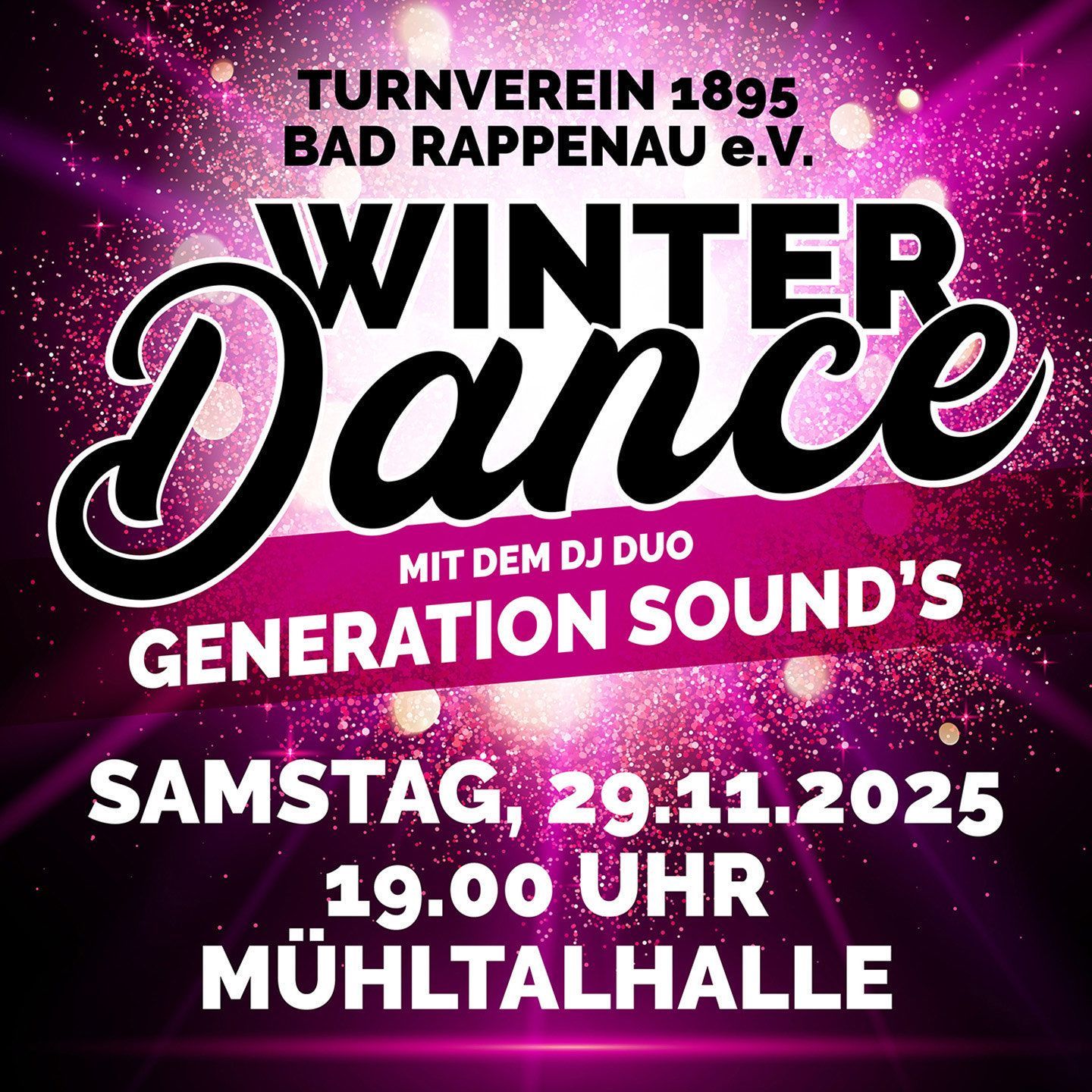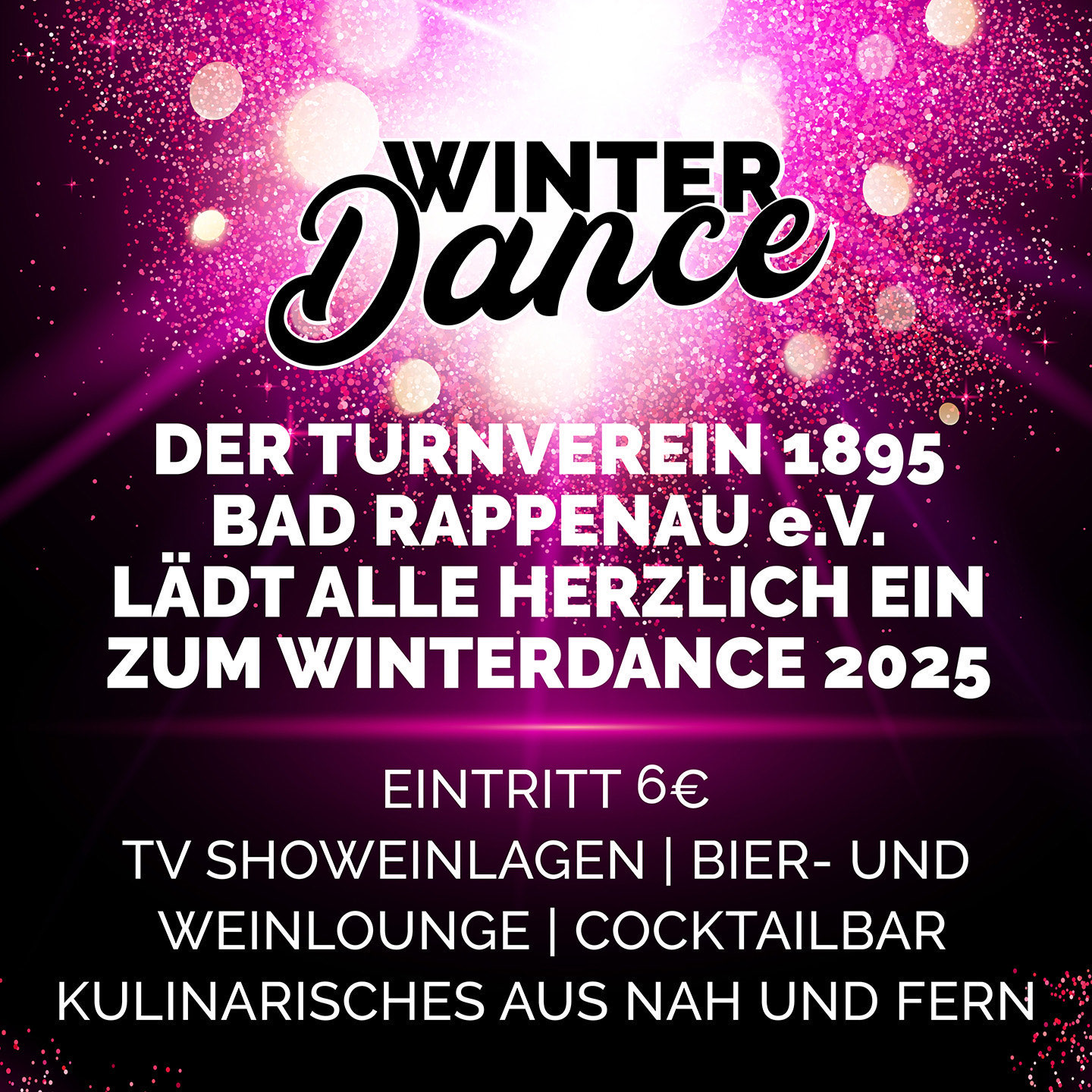 Wir laden alle herzlich zum Winterdance am 29.11.2025 in der Mühltalhalle ein! Es erwartet Sie ein bunter Abend voller Musik, die Sie das Tanzbein schwingen lässt, sowie TV-Showeinlagen. Für das leibliche Wohl sorgen eine Bier- und Weinlouge, eine Cocktailbar und es erwartet Sie leckeres Essen aus Nah und Fern.