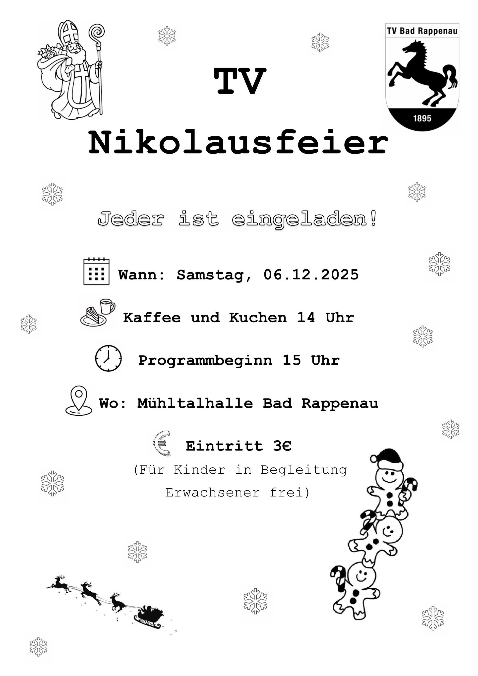 Noch nicht in Weihnachtsstimmung? Da wird Ihnen unsere alljährliche Nikolausfeier Abhilfe verschaffen! Am 6. Dezember ist es wieder so weit - der Nikolaus hat seinen Besuch in der Mühltalhalle angekündigt. Neben Kaffee und Kuchen erwartet Sie ein abwechslungsreiches Programm, welches von den Jüngsten in unserem Turnverein auf die Beine gestellt wurde. Freuen Sie sich auf einen tollen Nachmittag, den Sie zusammen mit Ihrer Familie genießen können.